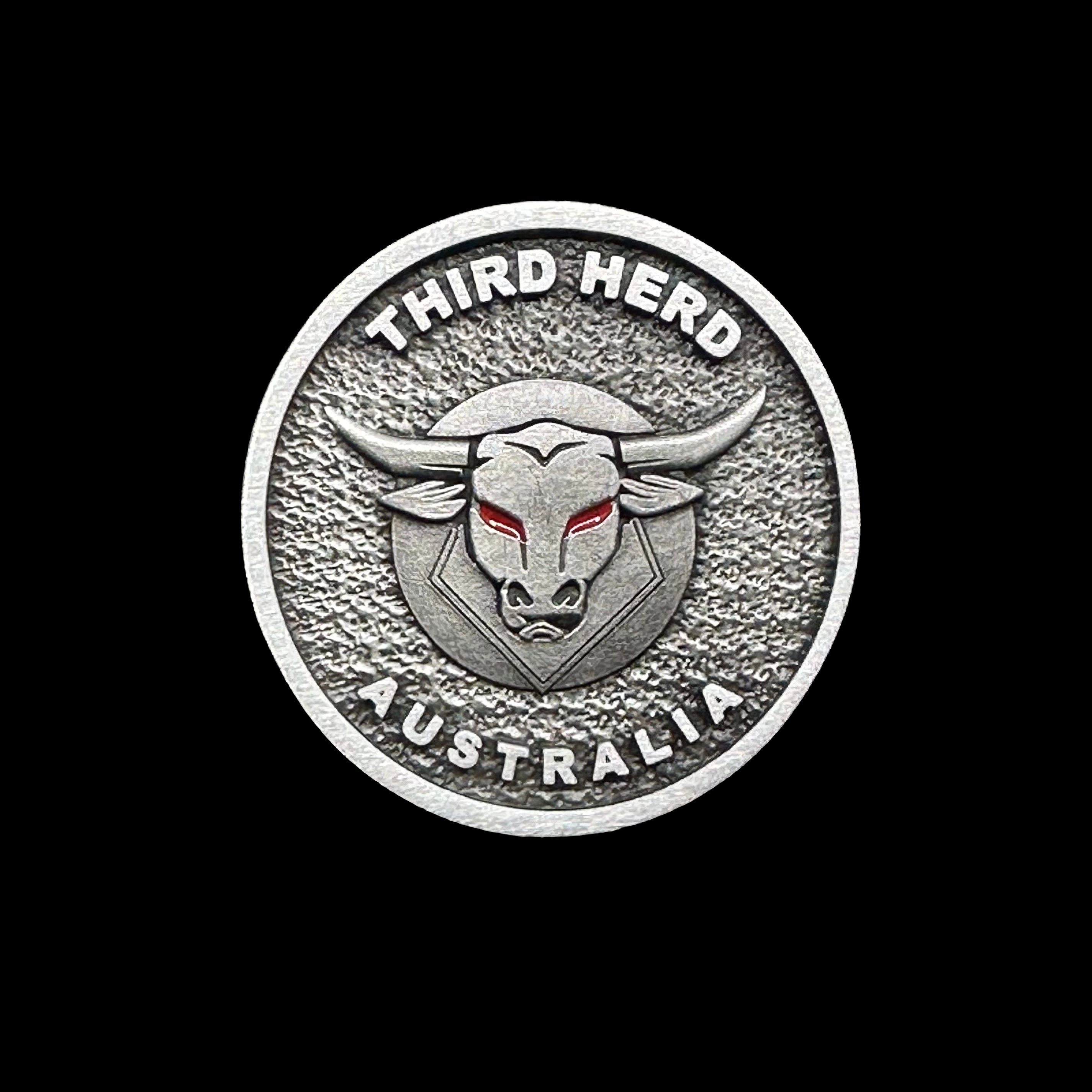 3D Pewter challenge coin embossed with the 3SQN Insignia, Incl. coloured 'red eyes' to the front and Regiment Winged Dagger to the reverse (44mm Dia).