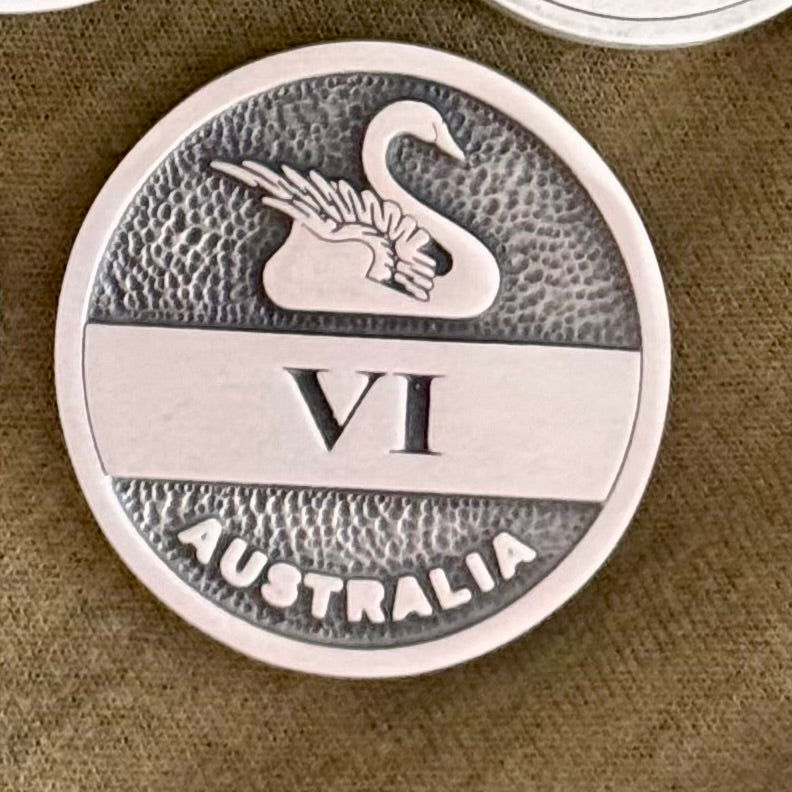 Pewter challenge coin embossed with the 6SQN Insignia, Incl. 'VI' to the front and Regiment Winged Dagger to the reverse (44mm Dia).