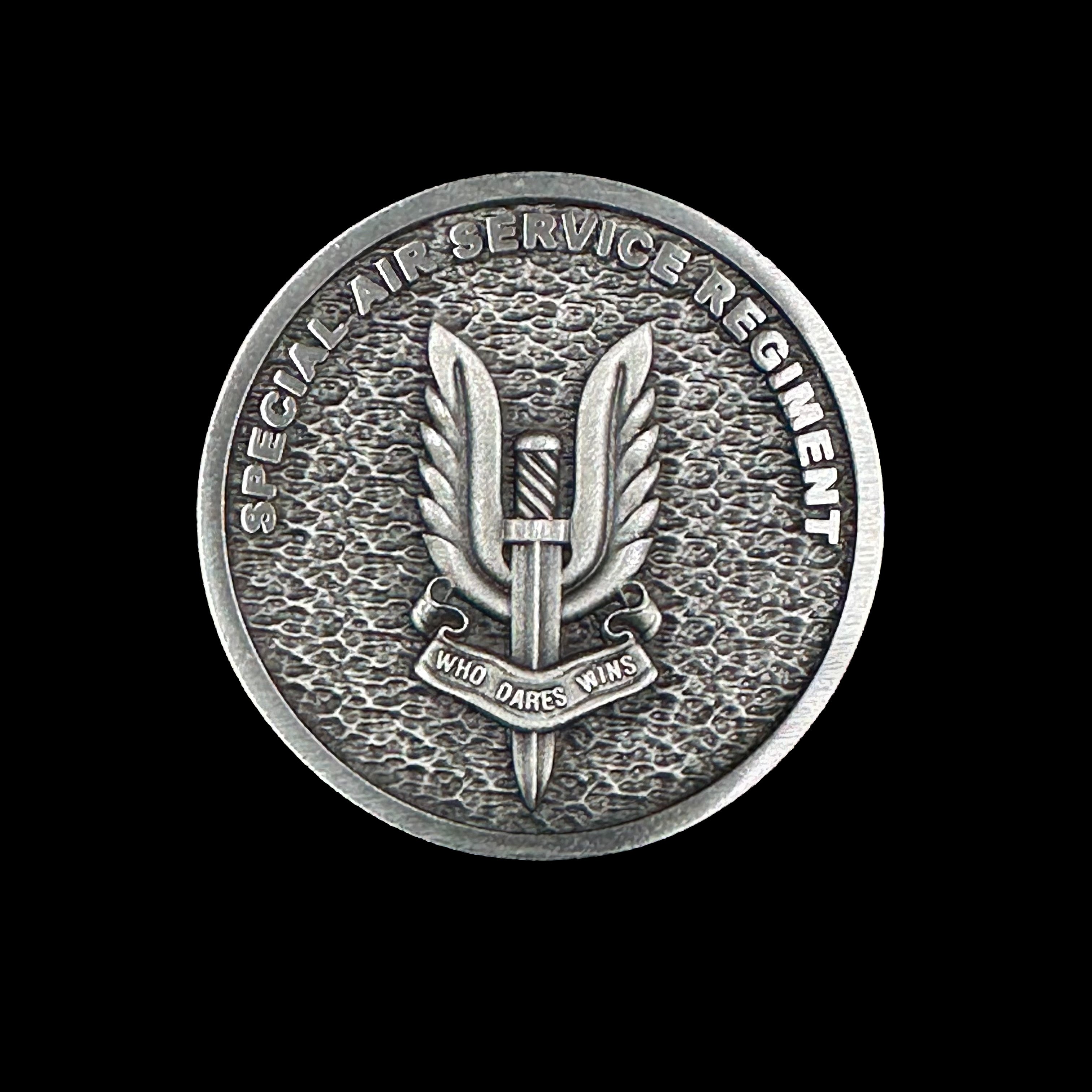 3D Pewter challenge coin embossed with the SASR Minion to the front and Regiment Winged Dagger to the reverse (44mm Dia).