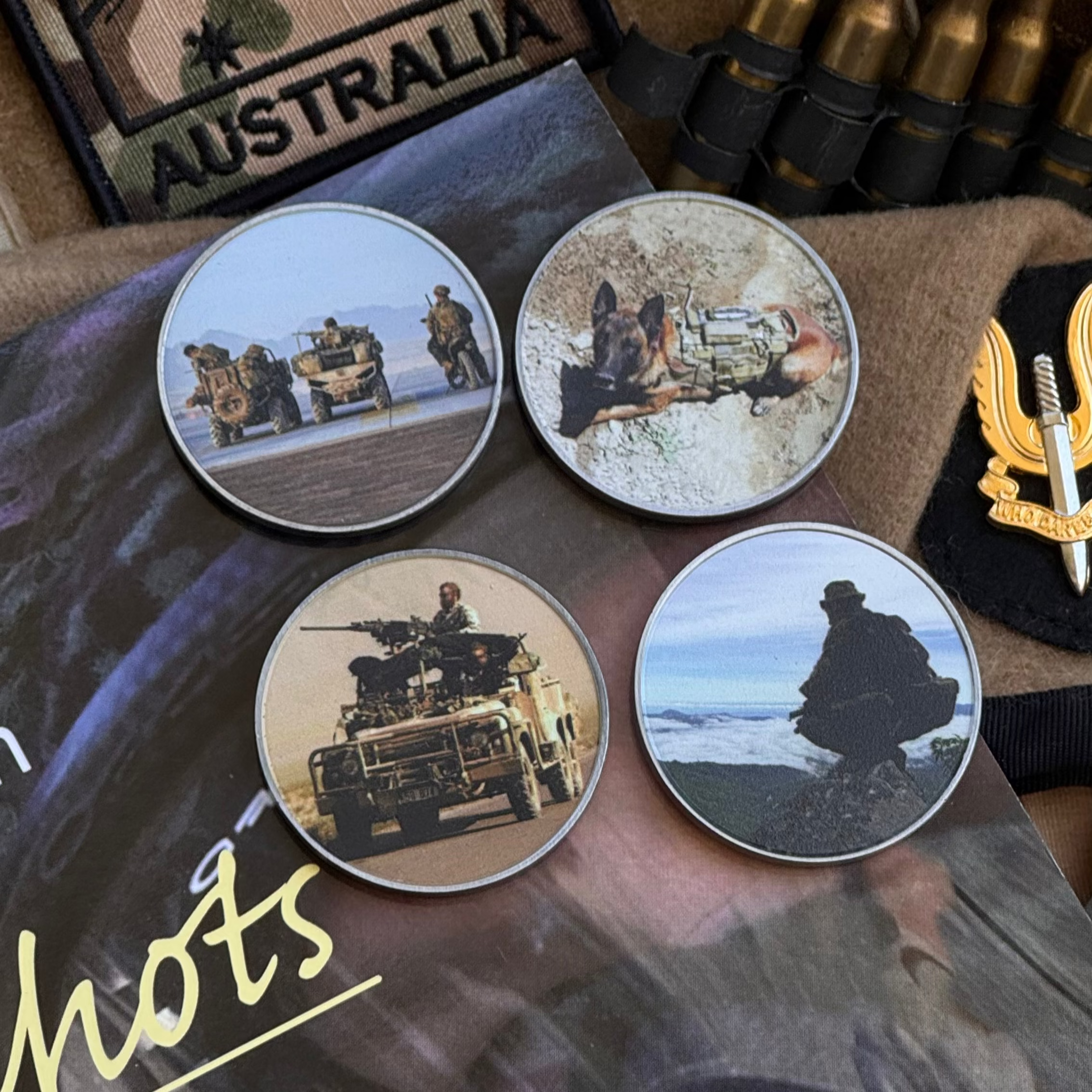 A unique set of 4 coins, depicting bold images of the SASR in training and on operation.