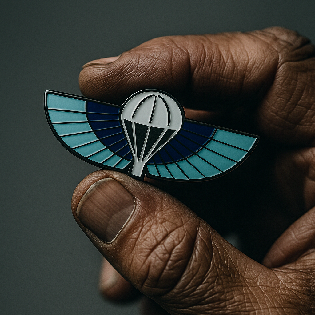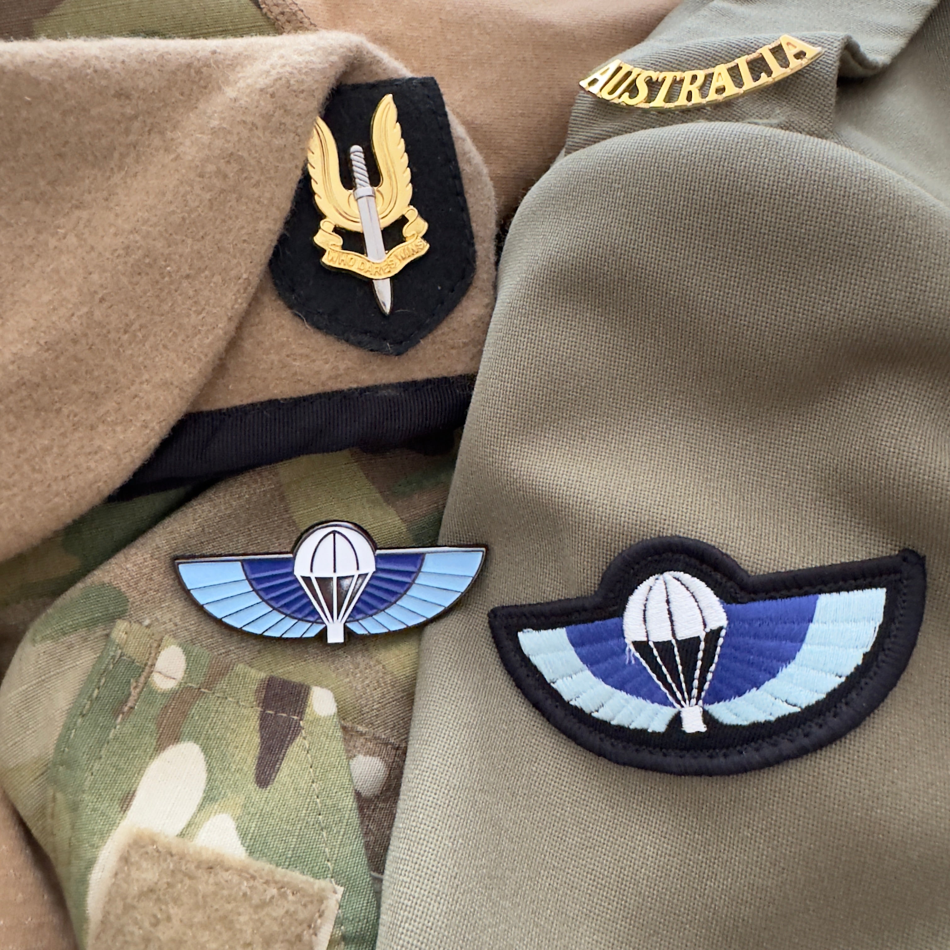 All Australian SASR qualified personnel are trained parachutists and the wings denoting this military speciality are those designed by Lieutenant John Steel 'Jock' Lewes a founding member of the British SAS in World War II.
