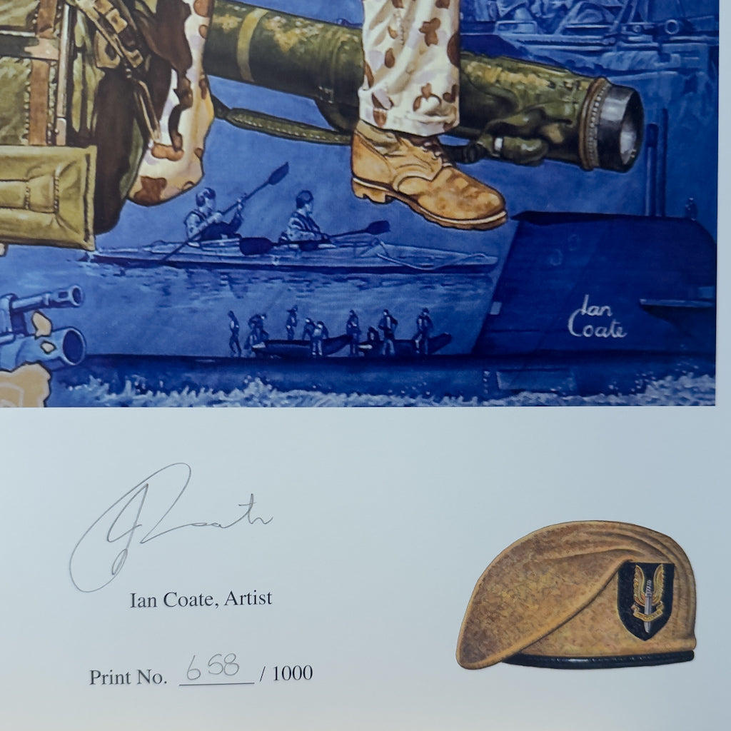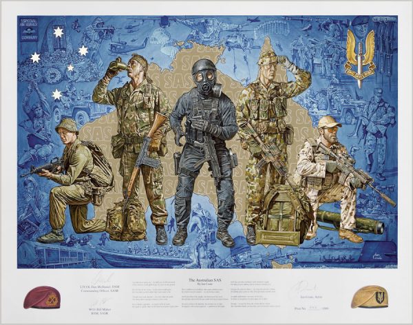 “This Artwork commemorates the 50th Anniversary of the formation of the 1st SAS Company in 1957. The five central figures, in contemporary clothing and equipment represent operational milestones in the history of the Unit (Borneo, Vietnam, Counter Terrorism, East Timor and the Middle East). These figures stand together as a wall protecting Australia, with primary colours representing the hard-won sandy beret, the blue ocean, and the Australian flag".