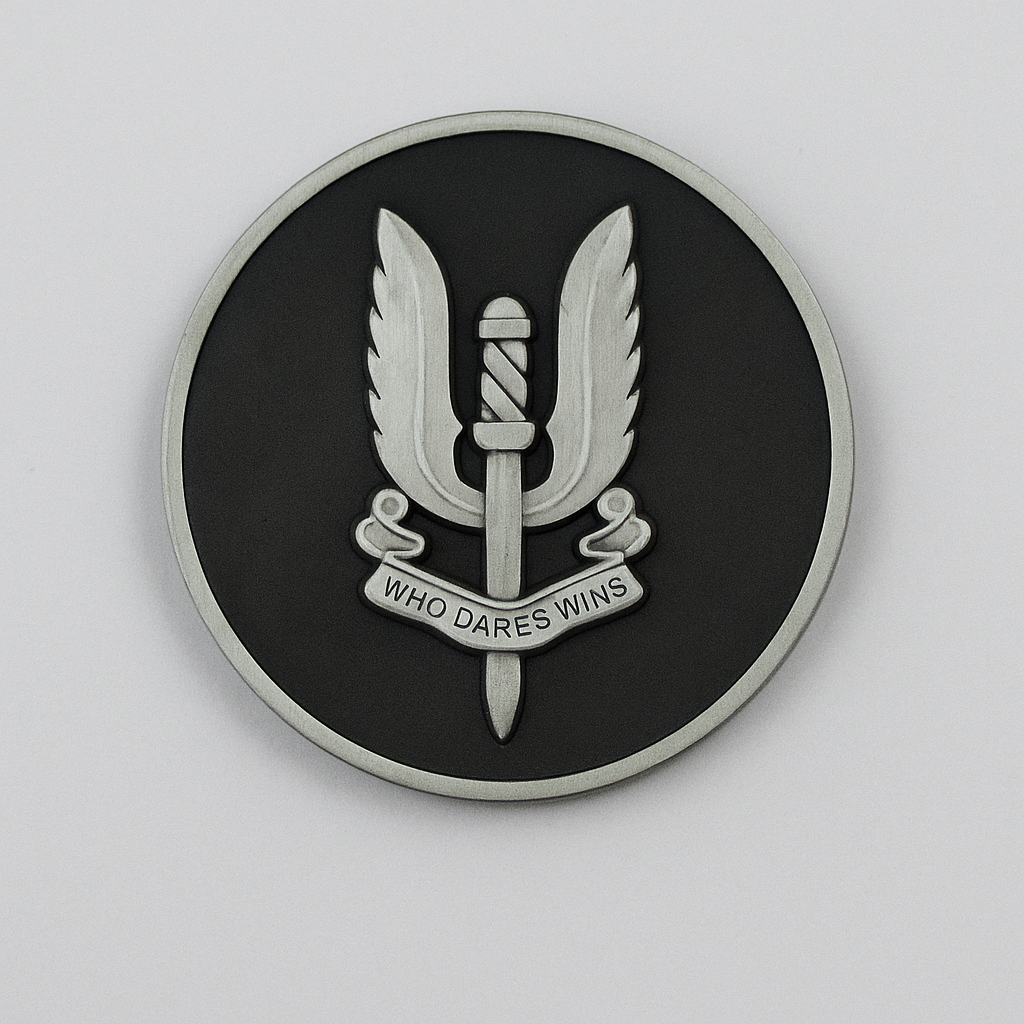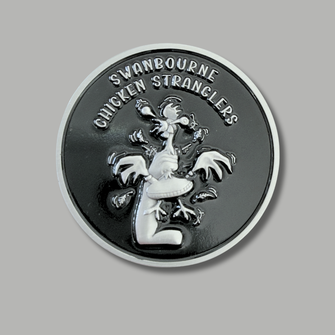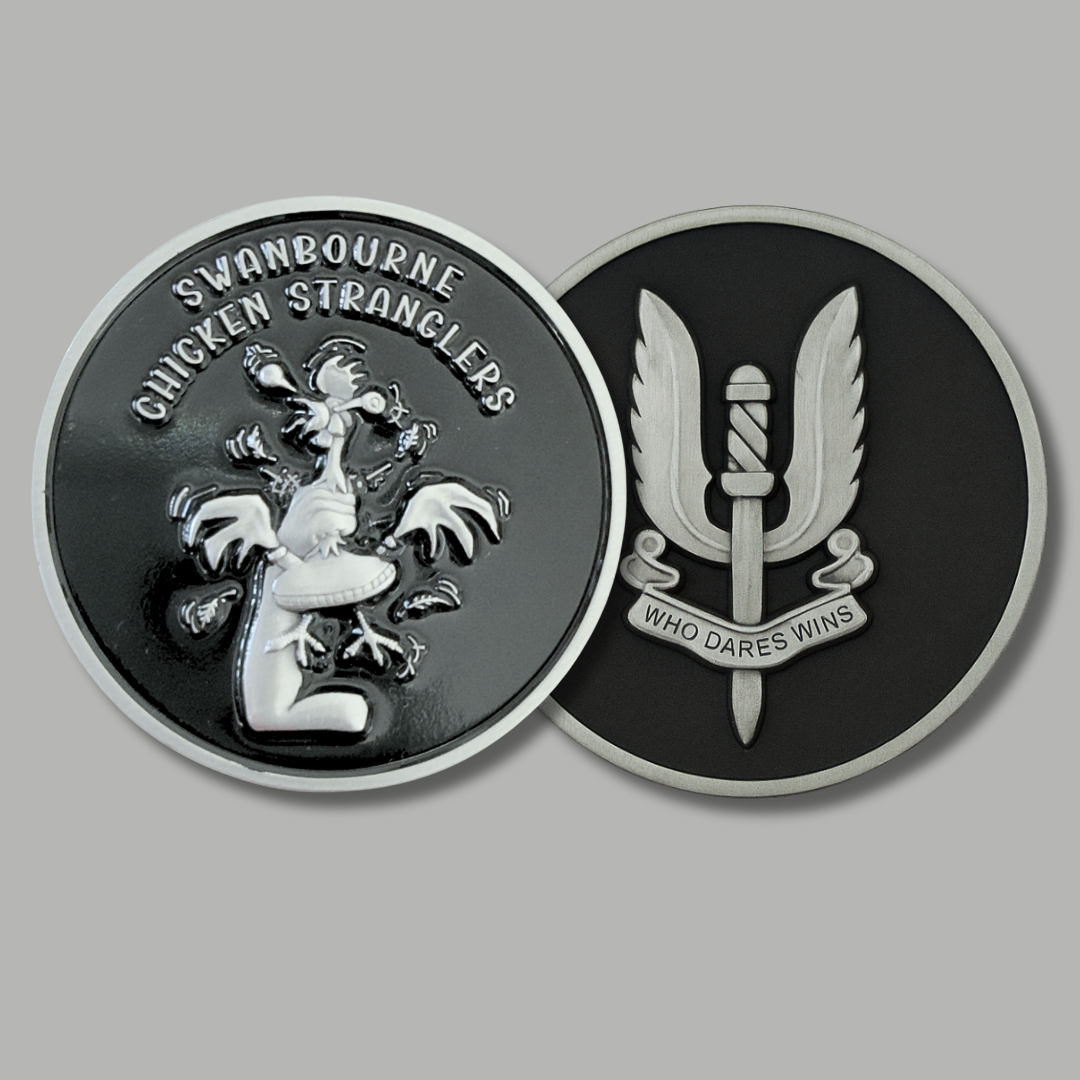 This limited-edition challenge coin carries the original Chicken Stranglers logo on gloss black on the front and a matte black rear side with the embossed silver Regiment Insignia.