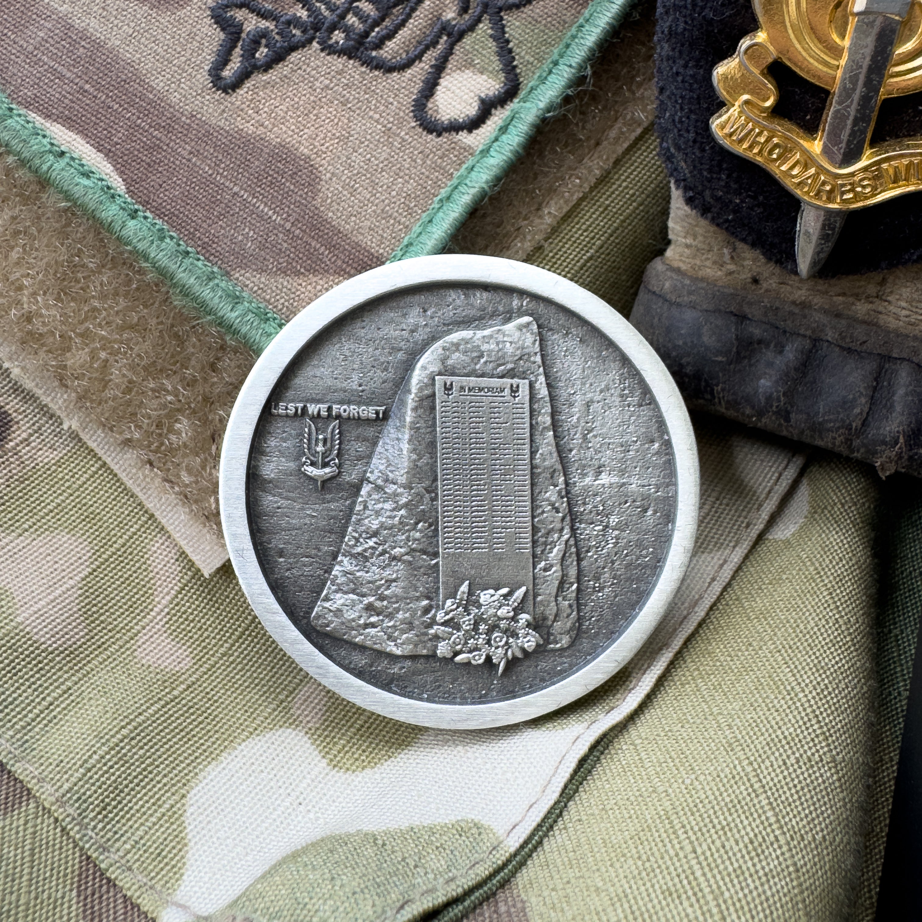 • Front Design: Features 'The Rock' - the central monument of the SAS 'Garden of Reflection' at Campbell barracks, inscribed with the names of Australian SASR personnel who have fallen in active service or training. The iconic winged dagger emblem is also prominently displayed.