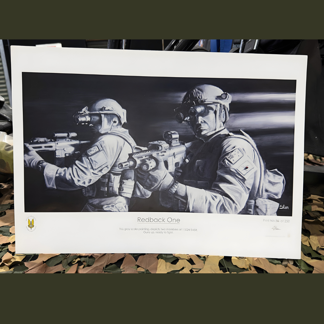 Printed at 594 x 420mm, Redback One arrives ready to be framed and is suited to a study, office, or private collection as a strong, understated representation of modern Australian Special Forces.
