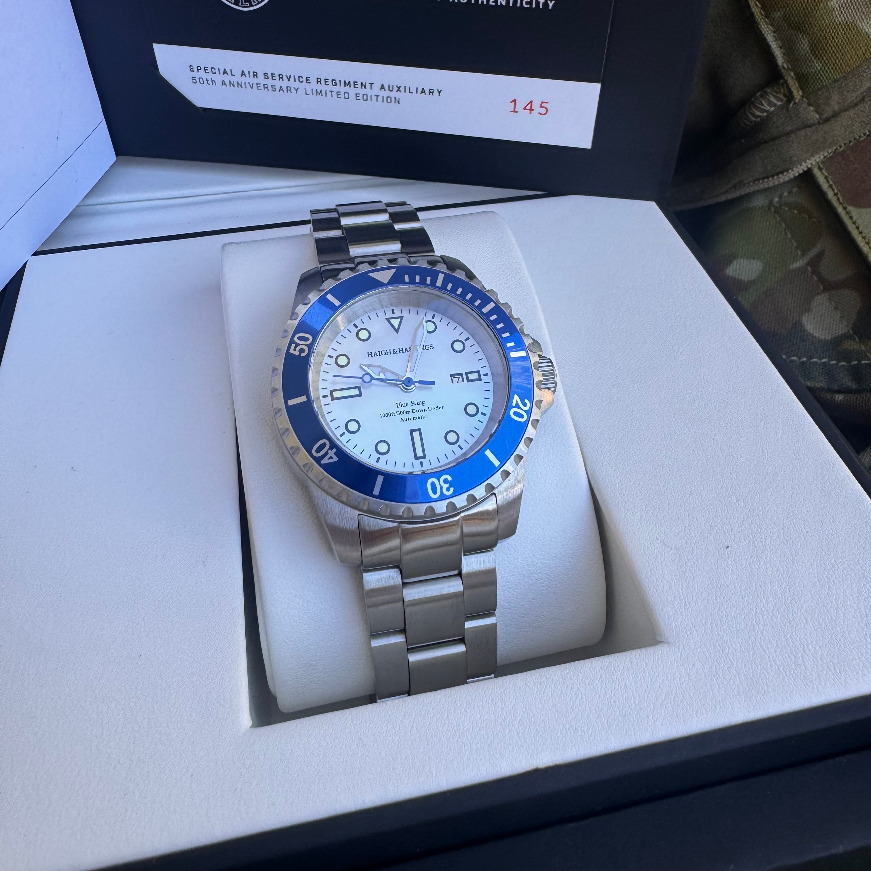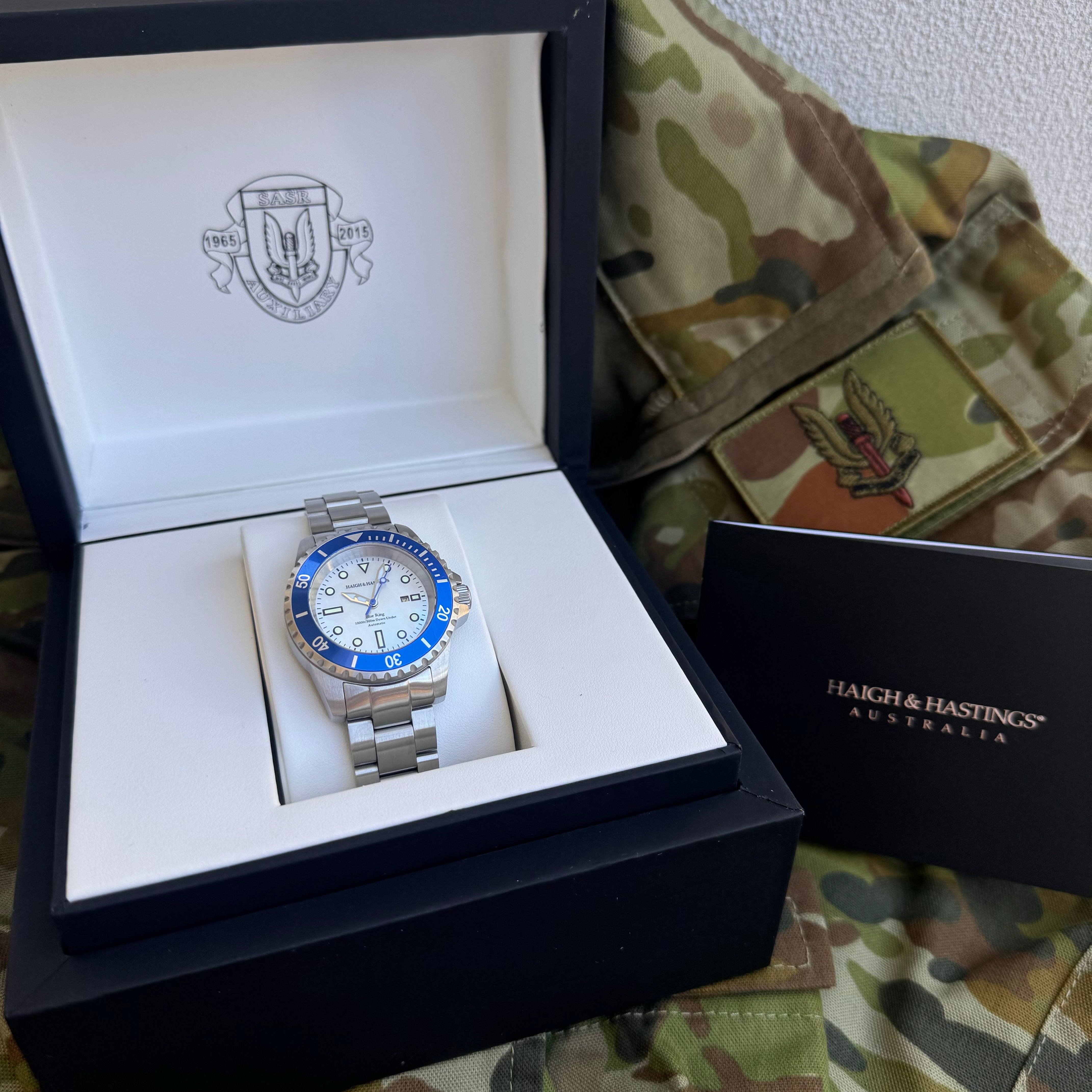 It features a blue bezel and black rubber strap, embossed with the Australian Special Air Service Regiment commemorative case back design. The timepiece is individually numbered and presented in a box carrying the SASR insignia and comes with an official Certificate of Authenticity.